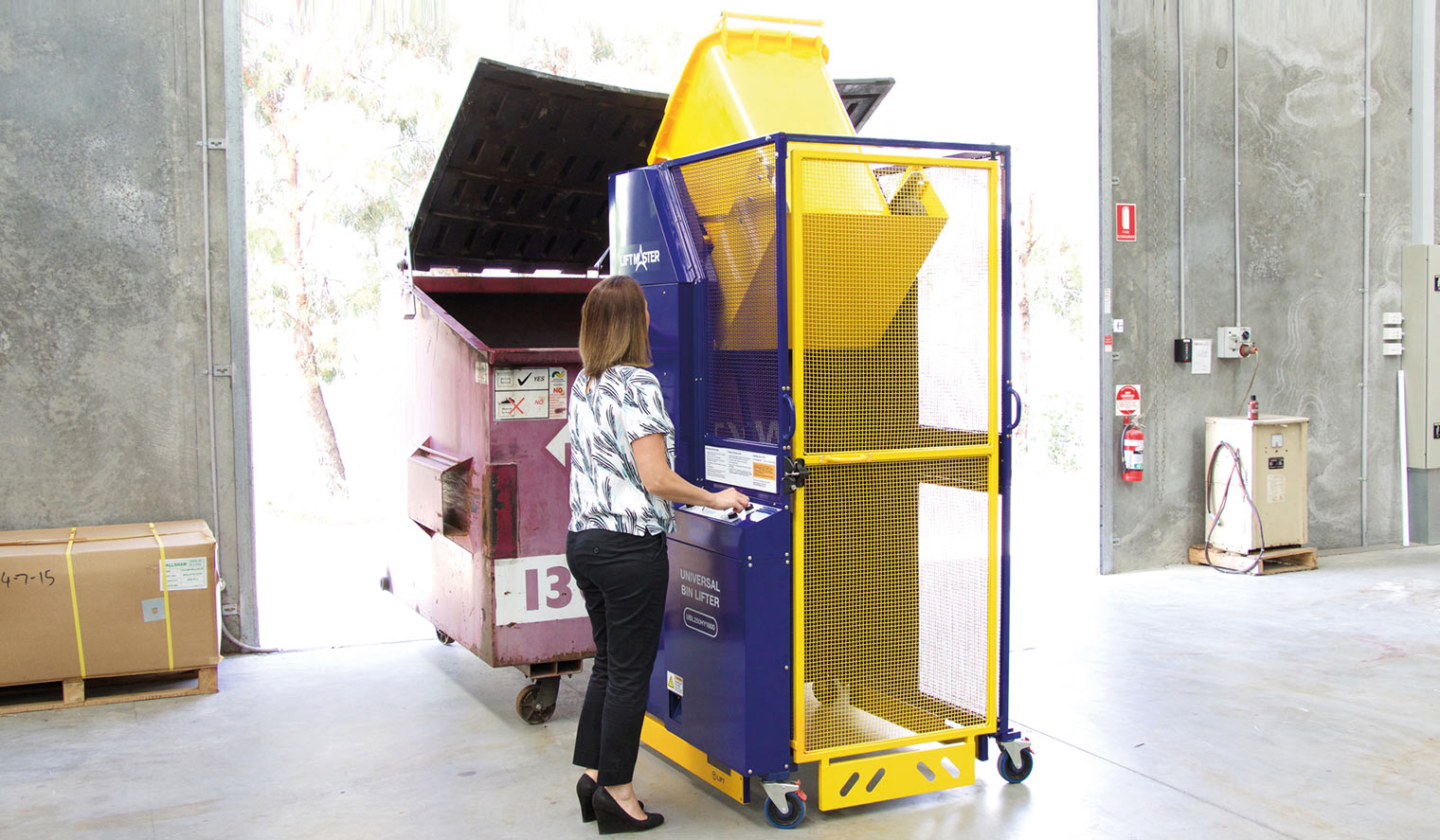 The Universal bin lifter/tipper in action