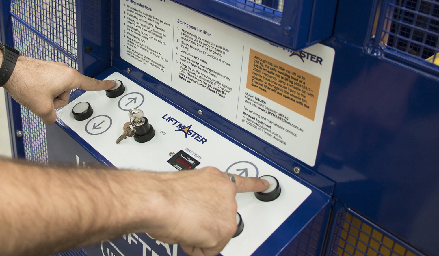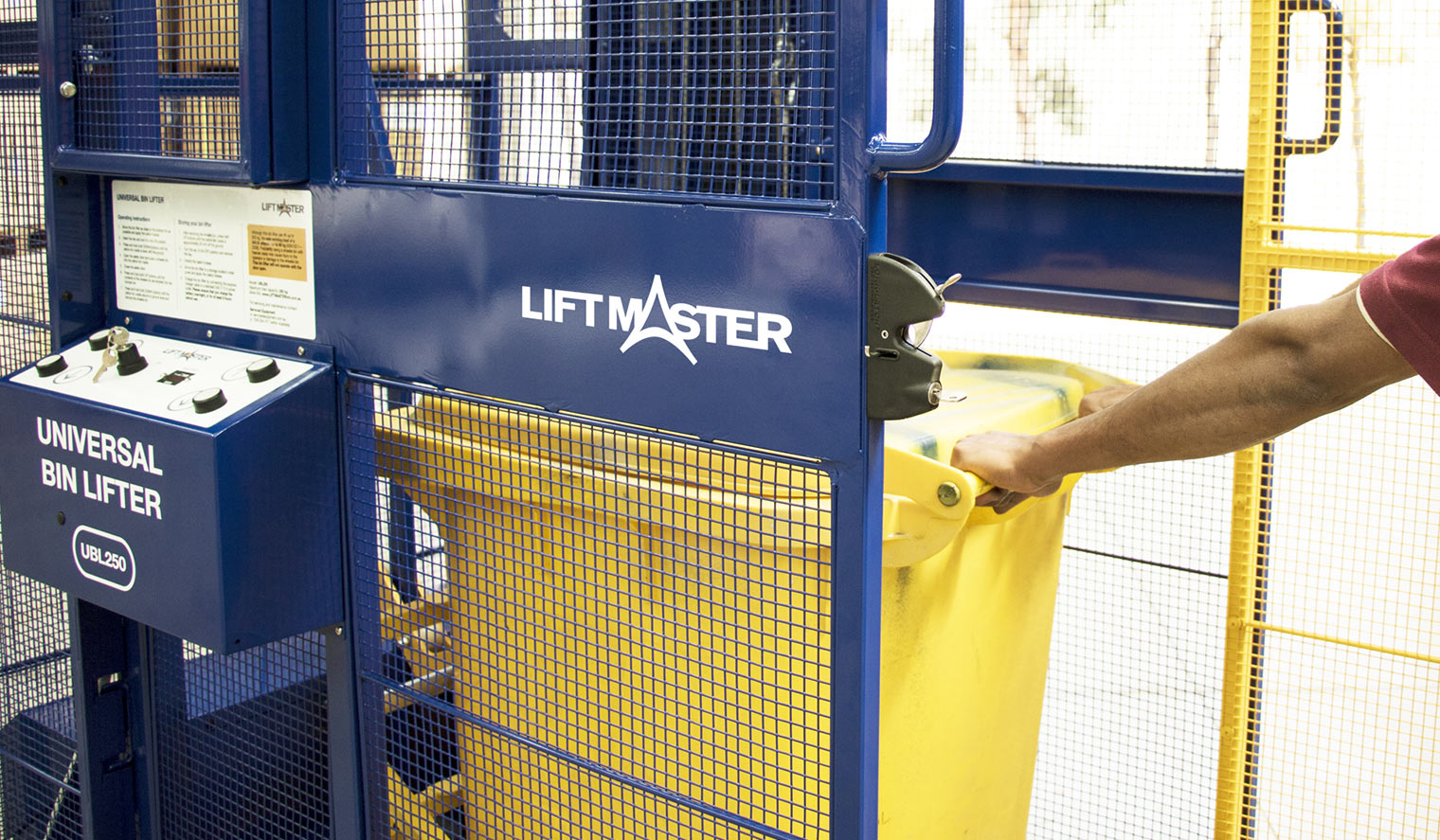 The Liftmaster Universal Bin Lifter and Tipper is a fully enclosed battery operated bin lifter/tipper, designed for ease-of-use with its push button controls. It is a safe way for a single user to effortlessly lift and empty heavy wheelie bins—weighing up to 250kg—into skip bins. It can be used in high pedestrian traffic areas such as schools and supermarkets, as it features a safety cage and a lockable door to help protect the user or passers by from injury.